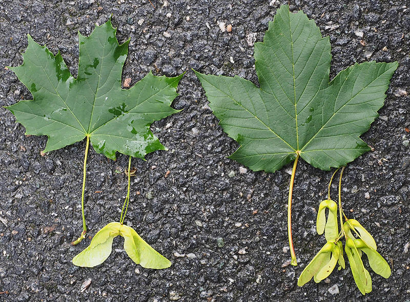 spisslønn (Acer platanoides) til venstre og platanlønn (Acer