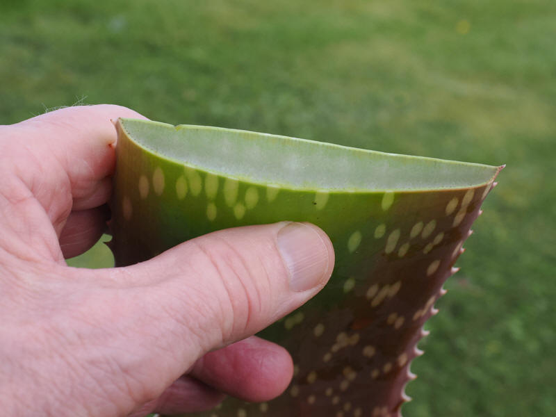 over viser et blad av Aloe vera som er delt på langs. Bladet inneholder