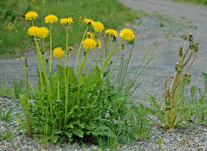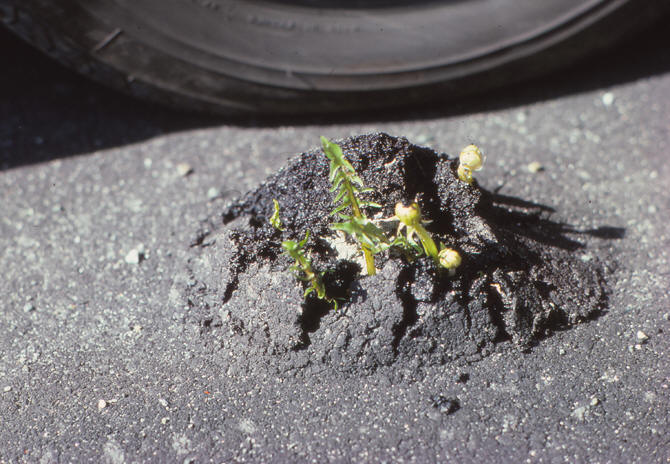 | Løvetann har stor vekstkraft. Her bryter den seg gjennom nylagt asfalt. |