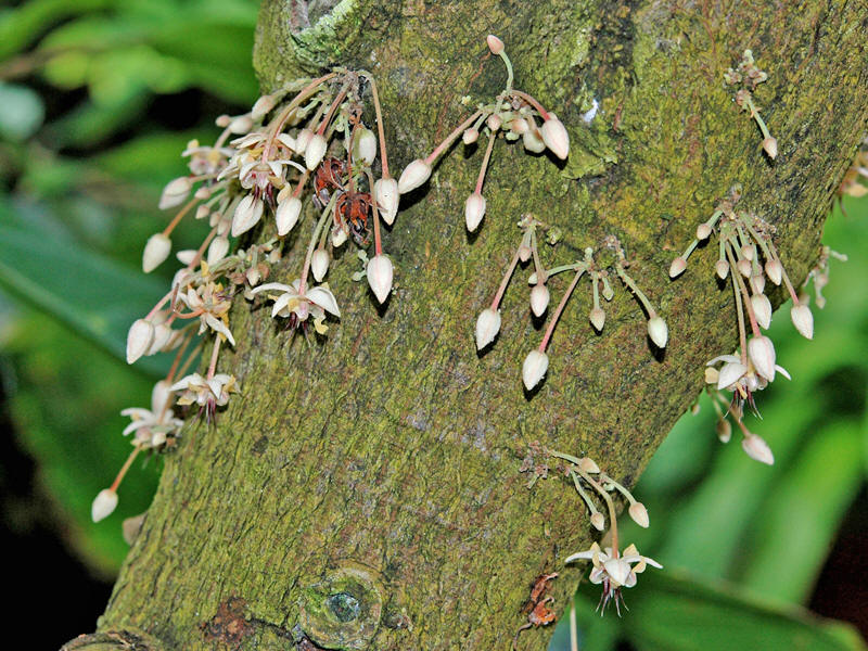 | Kakaotreet har kauliflori, det vil si at de små blomstene vokser direkte ut fra selve stammen eller greinene, uten at det sitter blad under dem. |