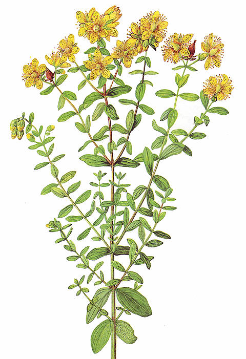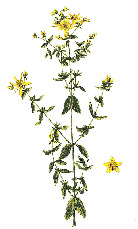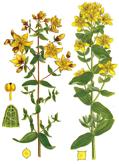 | Illustrasjon hentet fra Bilder ur Nordens Flora. Bildet viser prikkperikum til venstre og firkantperikum til høyre |