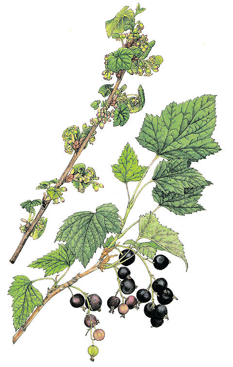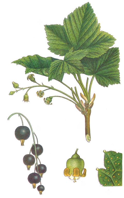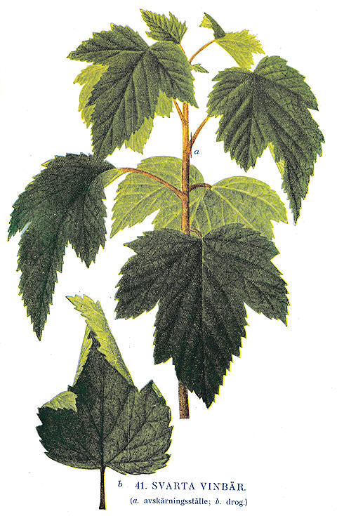 | Denne illustrasjonen av solbærblad er hentet fra Våra Medicinalväxter av Lind og de Verdier, Stockholm 1917 |
