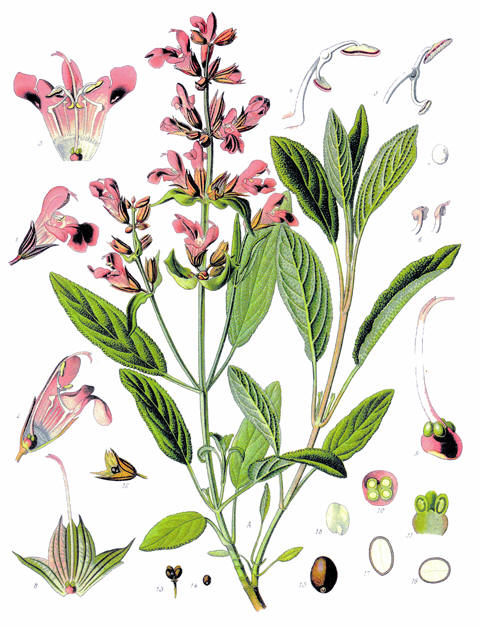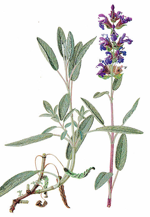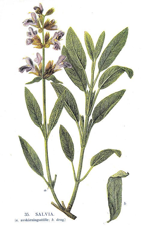 | Denne illustrasjonen av salvie er hentet fra Våra Medicinalväxter av Lind og de Verdier, Stockholm 1917 |