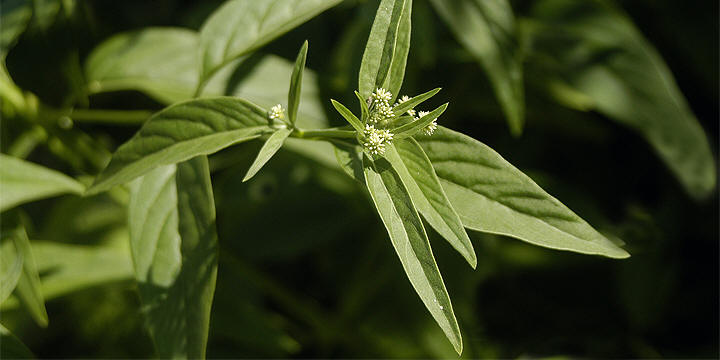 lange. Planten har små grønnhvite blomster i greinete rakler. Suma