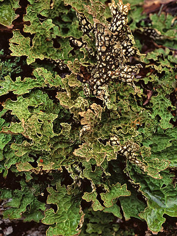 formering. Oversiden av laven er grønn til olivenbrun, undersiden