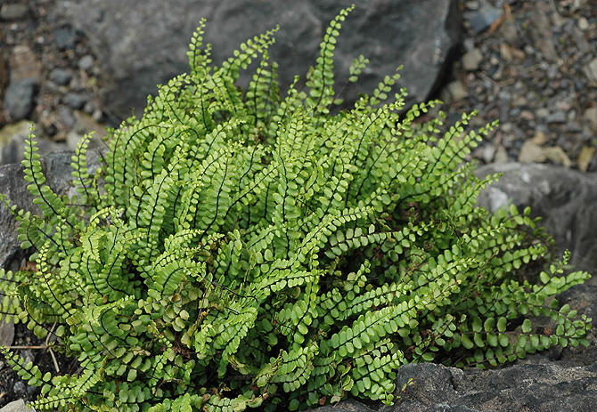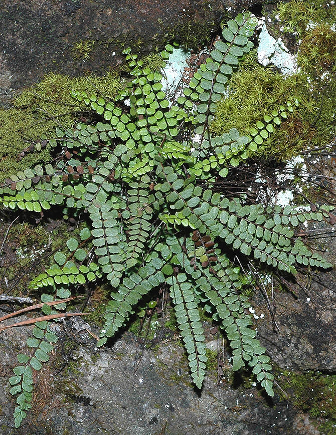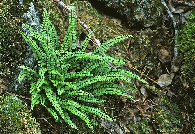 ganske vanlig på fuktige bergvegger, i urer og på steinmurer. Finnes