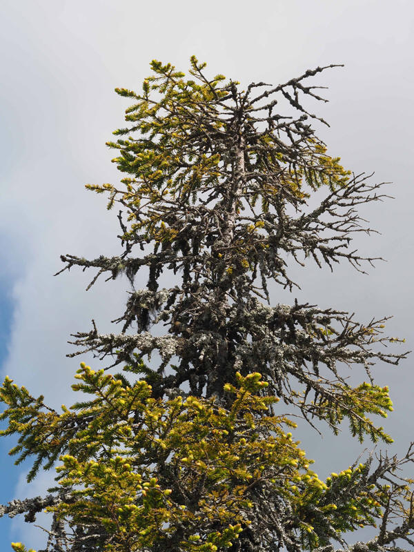 toppen på ei ca. 4 m høy, halvdød gran som står på ei myr. Bildet er