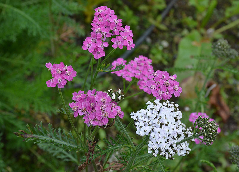 | Hageform av ryllik med rosa blomster, sammen med en vanlig hvit ryllikblomst. |