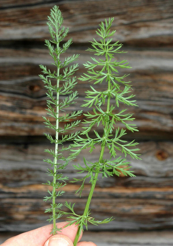 ligner bladene til karve (Carum carvi). Ryllikblad til venstre