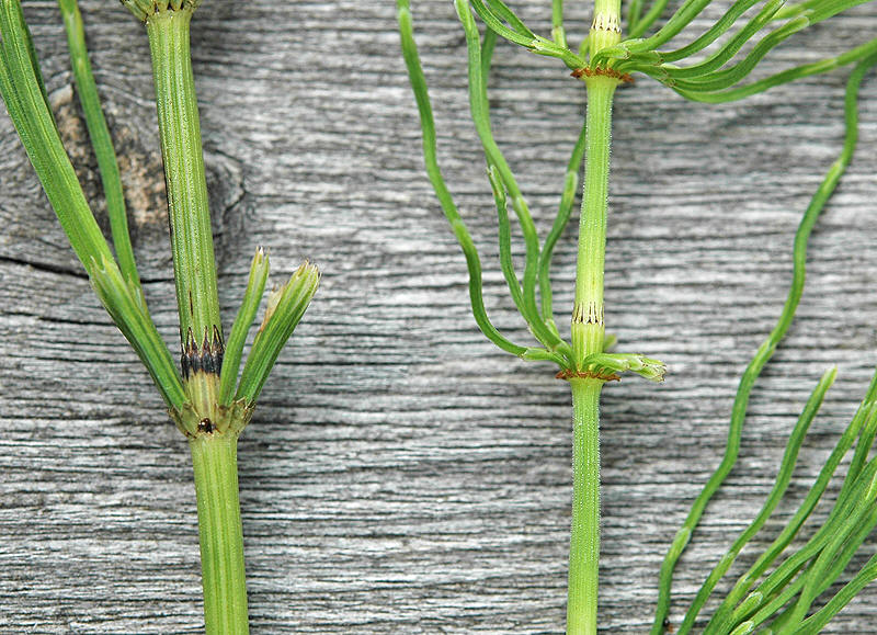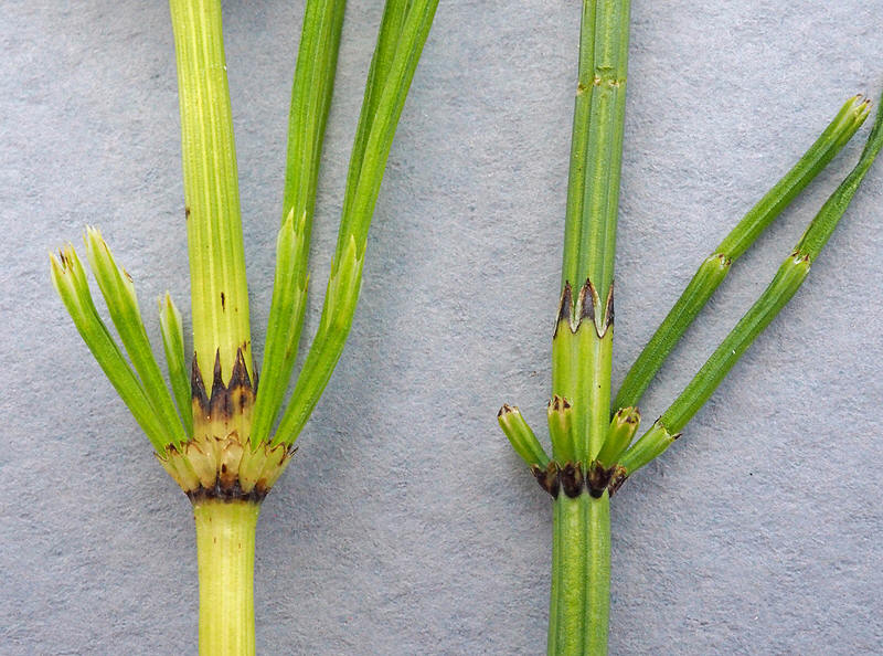 | En annen skillekarakter mellom åkersnelle og engsnelle er at hos åkersnelle (planten til venstre) er nederste leddet på greinene lengre enn tannkransen på hovedskuddet, mens det hos engsnelle (planten til høyre) er like langt eller noe kortere enn tannkransen på hovedskuddet. | ||||||||||||