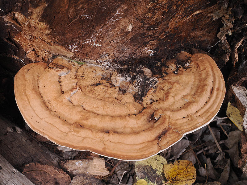 | Flatkjuke produserer enorme mengder med sporer, som her ligger som et brunt teppe under soppen. |