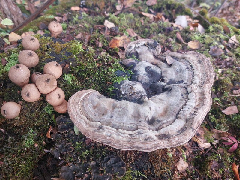 | Flatkjuke som vokser sammen med pærerøyksopp (Lycoperdon pyriforme) på en råtten bjørkestubbe. |
