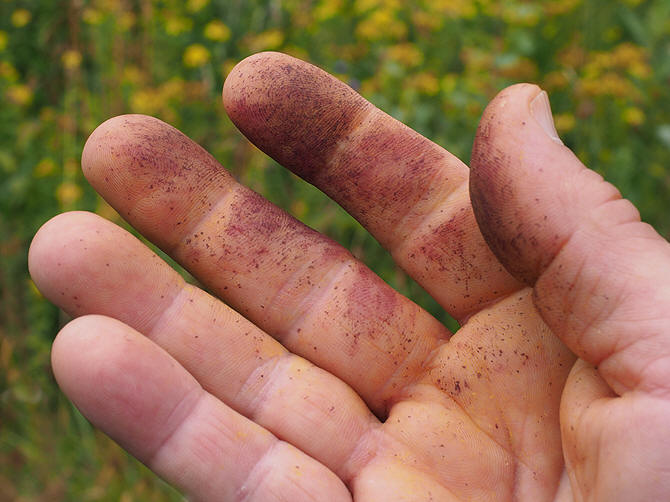 | Når man plukker perikumblomster blir fingrene farget purpurrøde av et fargestoff på knoppene og blomstene. |