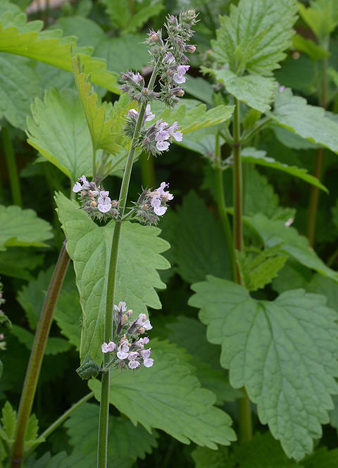 | Dette bildet viser en sitronduftende kultivar av kattemynte, Nepeta cataria 'Citriodora'. |