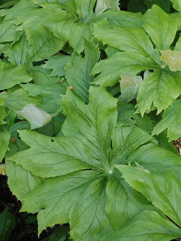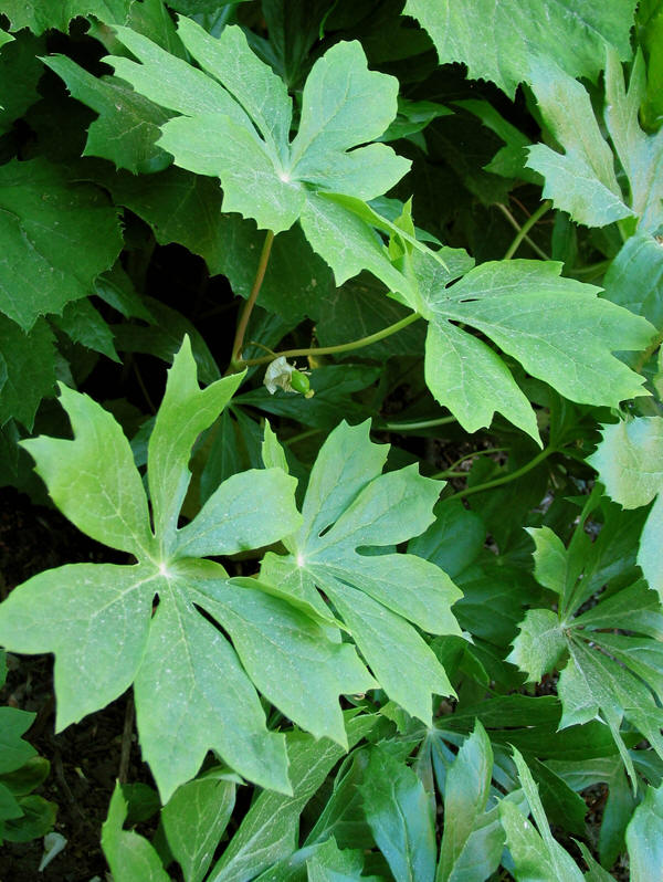 Podophyllum perltatum er hjemmehørende i den atlantiske regionen av Nord-Amerika, hvor den vokser i skyggefull løvskog i både USA og Canada. Denne eldgamle medisinen til nordamerikanske indianere har vært brukt som utrensende middel, brekkmiddel, ormemiddel og som abortfremkallende middel. I de seinere år har stoffet podophyllotoksin blitt brukt som supplement til strålebehandling av kreft, da det kontrollerer veksten av visse svulster pga. av sin virkning på celledelingen (antimitotisk).. Fotblad er en giftig plante og de giftige komponentene er lignane podophyllotoksin, alfapeltatin og betapeltatin. De er hovedkomponentene i podophyllin-harpiks som blir utvunnet fra jordstengler av planten for den farmasøytiske industrien. Peltatinene har en kraftig avførende virkning, mens podophyllotoksin er enda mer giftig. Den vanligste årsaken til forgiftning er inntak av for store doser av roten. Symptomer er diaré med blodig avføring som også inneholder biter av tarmslimhinnen og galle.. Det har videre en skadelig effekt på hjertet, gir dyp utmattelse og død på grunn av hjertesvikt. En dødelig dose av podophyllin er 0,3-0,5 g. Forgiftning er ikke rapportert hos dyr, fordi de overjordiske delene av planten ikke er giftige. Også fruktene er noe giftige og kan forårsake fordøyelsesproblemer, men helt modne frukter er mindre giftige og kan spises i små mengder etter at frøene er fjernet. Smaken er søt og syrlig, og fruktene har tradisjonelt blitt utnyttet av urbefolkningen i Nord-Amerika. De kan spises naturell eller brukes til syltetøy, marmelade, saft og fruktkompott. Homeopatmiddelet Podophyllum lages av røttene til fotblad, eller av hele den friske urten. Podophyllum virker i hovedsak på tolvfingertarmen, tynntarmen, leveren og endetarmen. Det gis mot katarr i mage-tarmsystemet med kolikksmerter, oppkast av galle og diaré, eller hvis leverregionen er følsom pga. betennelse eller gallestein. |