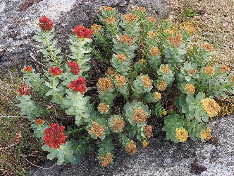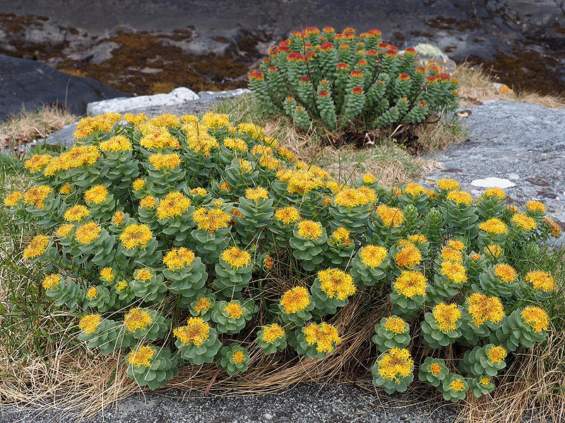 | En hannplante (i forgrunnen) og en hunnplante (bak) av rosenrot, fotografert på Smøla i Møre og Romsdal. | ||
