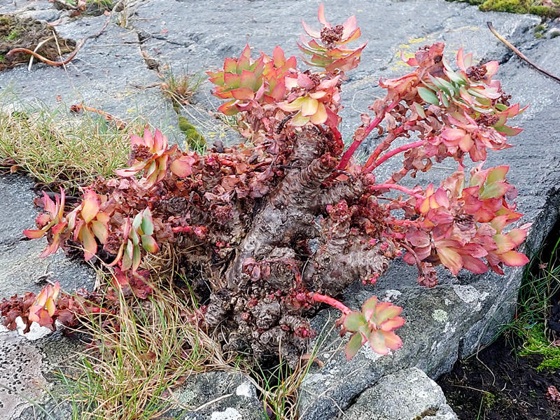 | Når det er lite jord å vokse i, vil mye av den kraftige rotstokken til rosenrot befinne seg over bakken. Denne planten ble fotografert på Smøla i Møre og Romsdal. | ||