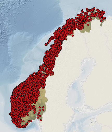 | Kart som viser registrerte funn av rosenrot på fastlandet i Norge, hentet fra Artsdatabanken (2022). | ||