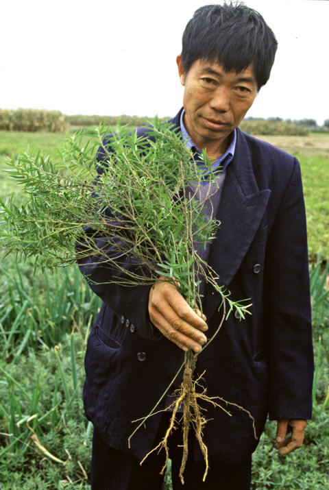 | Dyrkingsfelt for praktskjoldbærer nær Anguo i Kina. Oktober 2000. |