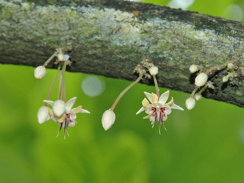 | Kakaotreet har kauliflori, det vil si at de små blomstene vokser direkte ut fra selve stammen eller greinene, uten at det sitter blad under dem. |