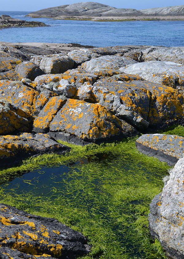 Tarmgrønske er en svært formvariabel grønnalge som vokser i saltvann eller brakkvann, ofte i vanndammer på strandberg (som vist på bildene). Den er vanlig langs hele kysten fra Oslofjorden til Finnmark. Algen tolererer forurensning godt, og man bør sanke tarmgrønske bare i områder med god vanngjennomstrømning. Tarmgrønske plukkes med hendene og spises frisk, eller den varmebehandles ved å forvelles raskt eller stekes lett i smør. Frisk tarmgrønske tåler å ligge et døgns tid i kjøleskap. Før man inntar tarmgrønske i frisk tilstand i f.eks. salater, bør den skylles godt i sjøvann eller ferskvann for å fjerne sand og smådyr som kan sitte mellom rørene. Tørket og lett ristet kan den brukes pulverisert i brød eller strøs over maten som krydder. Den er for eksempel god å strø over kokt ris. Tarmgrønske har ikke særlig mye smak, men den har en fin konsistens og et vakkert og delikat utseende. Algen kan fungere som en næringsrik grønnsak som inneholder fettsyrer, stivelse, kalk, fosfor, sporstoffer og vitaminer. |