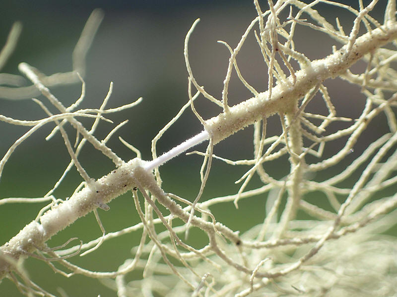 | Detalj av en strylav. Legg merke til den hvite og elastiske margstrengen som kommer til syne når man strekker laven mellom fingrene. Dette er et sikkert kjennetegn på Usnea-arter. |