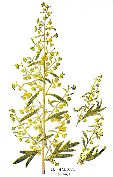 | Illustrasjonen av malurt er hentet fra Våra Medicinalväxter av Lind og de Verdier, Stockholm 1917 |
