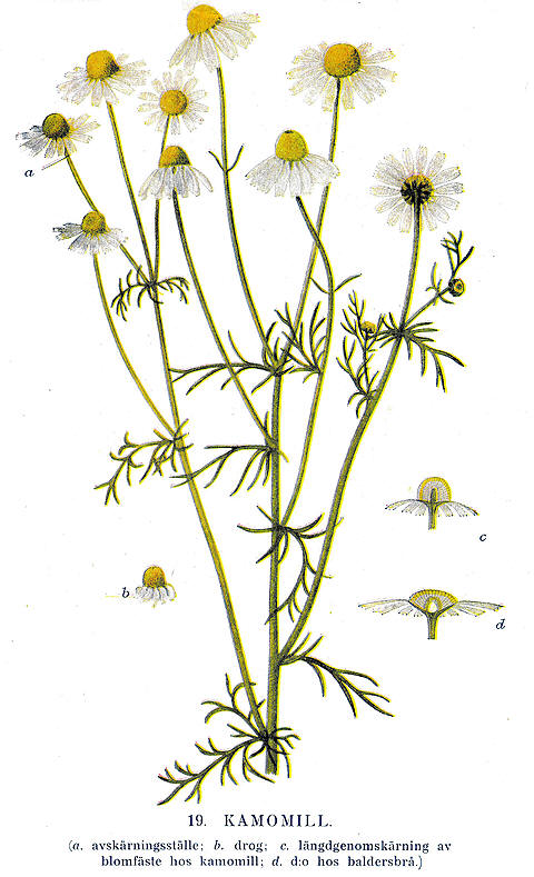 | Denne illustrasjonen av kamille er hentet fra Våra Medicinalväxter av Lind og de Verdier, Stockholm 1917 |