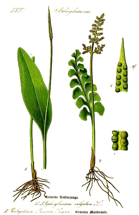 | Tegningen viser ormetunge (Ophioglossum vulgatum) til venstre og marinøkkel (Botrychium lunaria) til høyre. |