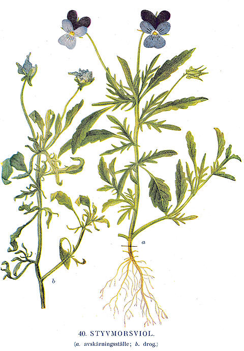 | Denne illustrasjonen av stemorsblomst er hentet fra Våra Medicinalväxter av Lind og de Verdier, Stockholm 1917 |