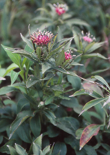 ovale til lansettformede blad og fiolette tistel-lignende blomster. |