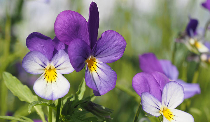 lansettformede, mens akselbladene er dypt fjærflikete. Blomstene har blå, gule og hvite farger (tricolor