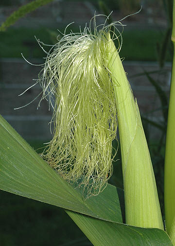 silkeglinsende dusker i toppen av bladhylsene som dekker maiskolben.